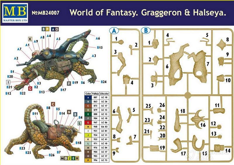 Набор состоит из одной литейной рамки с деталями, позволяющими создать фигурку девушки, находящейся верхом на фантастическом животном. Отметим, что фантастическое животное предполагает возможность выбора между двумя альтернативными головами, а снаряжение девушки позволяет использовать эту композицию как любителями жанра фэнтези, так и любителями космических приключений. Подчеркнем, что фигурки выполнены на достаточно высоком художественном уровне и доставят немало удовольствия моделистам при сборке. Кроме того, фигурки имеют собственные имена, для зверя - Граггерон, для девушки – Халсея.