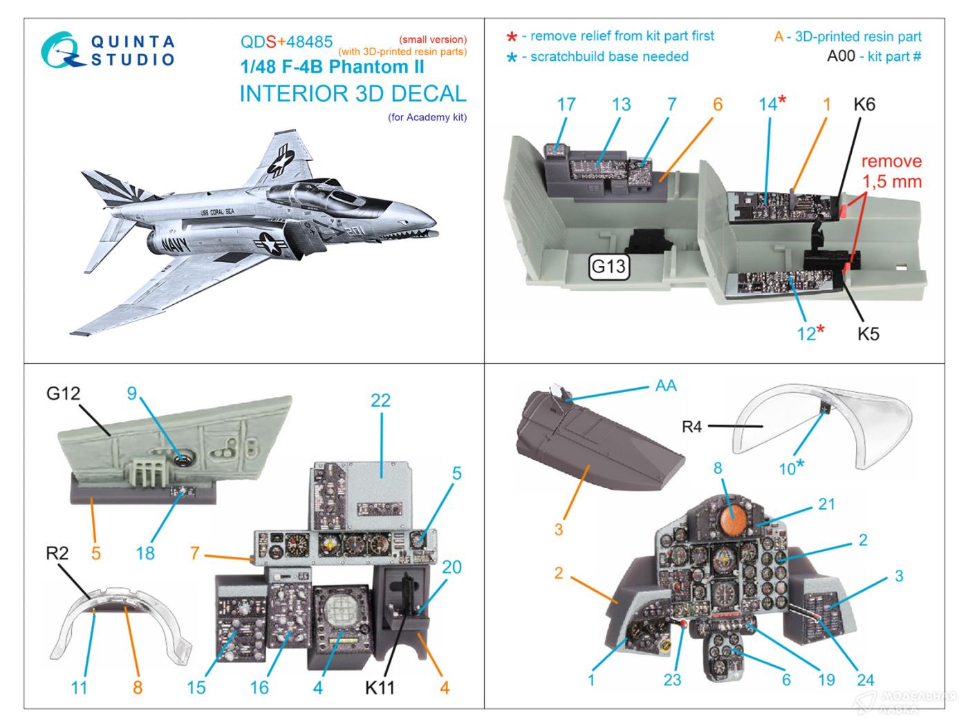 - 3D Декаль интерьера для F-4B Phantom II (Academy) (малая версия) (с 3D-печатными деталями)