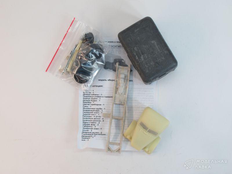 Рама - 1 Кабина - 1 Днище кабины -1 Подножки (левая и правая) - 2 Корпус будки - 1 Днище будки - 1 Бампер - 1 Щиток приборов - 1 Руль - 1 Выхлопная труба - 1 Карданный вал - 1 Передний мост - 1 Задний мост - 1 Рессоры - 4 (2+2) Колесные диски - 4 Колесная резина - 6 Фары стекло - 2 Ободки фар - 2 Габариты - 3 Номерной знак - 1 Клыки - 2 Дверные ручки - 2 Горловина бензобака - 1 Дворники - 2 Зеркало - 1 Оси - 2