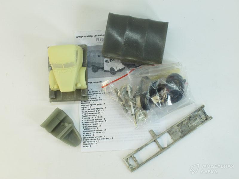 Рама - 1 Кабина - 1 Днище кабины -1 Подножки (левая и правая) - 1 Кузов тент - 1 Днище будки - 1 Сиденье тройное - 1 Бампер - 1 Щиток приборов - 1 Руль - 1 Выхлопная труба - 1 Карданный вал - 1 Передний мост - 1 Задний мост - 1 Рессоры - 4 (2+2) Колесные диски - 5 Колесная резина - 7 Фары стекло - 2 Ободки фар - 2 Габариты - 1 Крышки ящиков - 2 Номерной знак - 1 Клыки - 2 Дверные ручки - 2 Горловина бензобака - 1 Дворники - 2 Зеркало - 1 Оси - 2