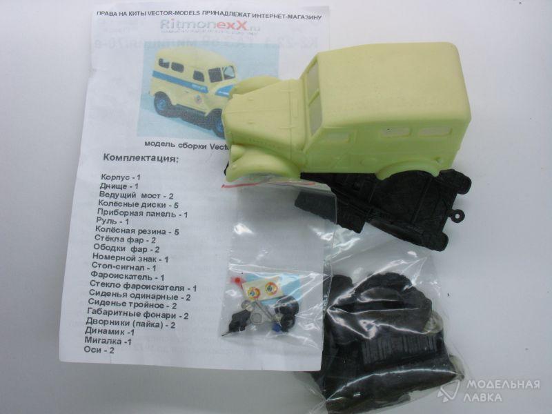 Комплектация: Корпус - 1 Днище - 1 Ведущий мост - 2 Приборная панель - 1 Стёкла фар - 2 Ободки фар - 2 Сиденья одинарные - 2 Сиденья тройные - 2 Фароискатель - 1 Стекло фароискателя - 1 Номерной знак - 1 Стоп-сигнал - 1 Диски колёс - 5 Резина - 5 Руль - 1 Габаритные фонари - 2 Дворники (пайка) - 2 Оси - 2