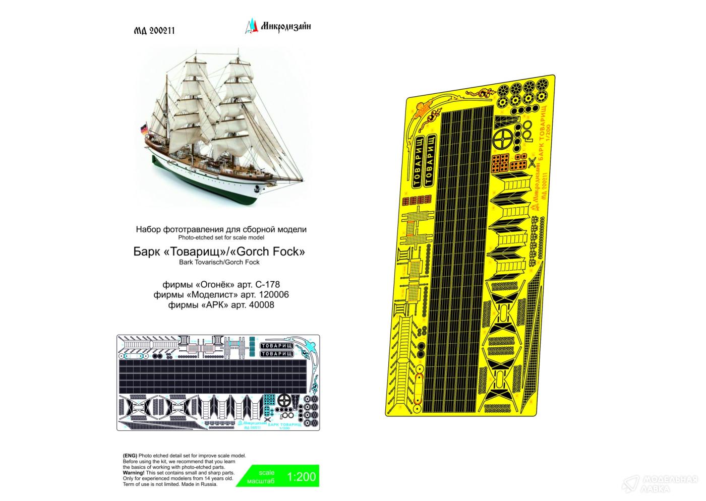 Набор фототравления для барка "Товарищ" от Tiger model. Масштаб 1:200. Материал: латунь 0,2 мм. Набор комплектуется пластиyjq фототравления и полноцветной инструкцией. . Количество уникальных деталей 31 шт. Уровень сложности: средний.