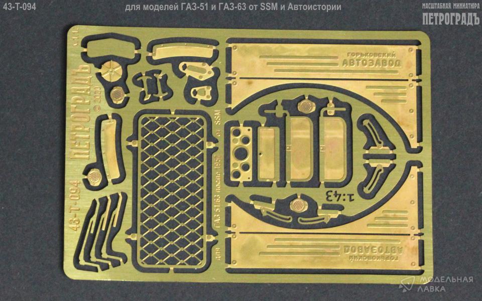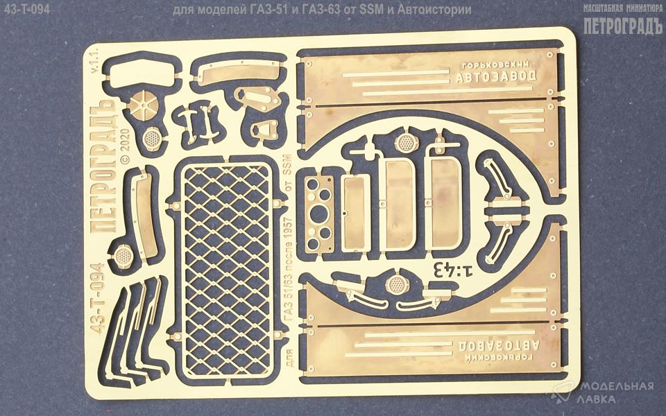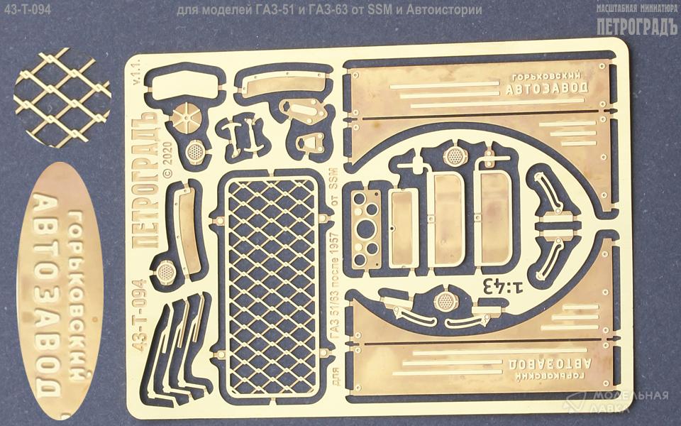 Базовый набор для 51/63 после 1957, только для SSM и Автоистории; в составе: боковые накладки капота с выштамповками "ГОРЬКОВСКИЙ автозавод", сетка на заднее окно кабины, кронштейны подъёма лобового стекла, противосолнечные козырьки, "дворники", накладки на приборную панель и торпедо, накладки на нижние задние углы крыльев ГАЗ-63, 1 пара крючков запора капота, 2 типа упора для заводной