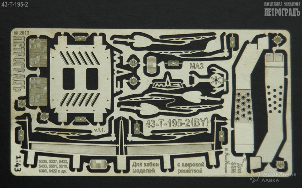базовый набор для доработки моделей СуперМАЗ (5337, 6422 и подобных) с широкой решёткой, в составе: пара подножек, солнцезащитные шторки, "дворники" (2 варианта по 3), внутренний кожух вентиляционного люка в крыше, эмблемы, катафоты двух видов на борта кабины и платформы, подложки фар головного света и противотуманок; альпак 0.16