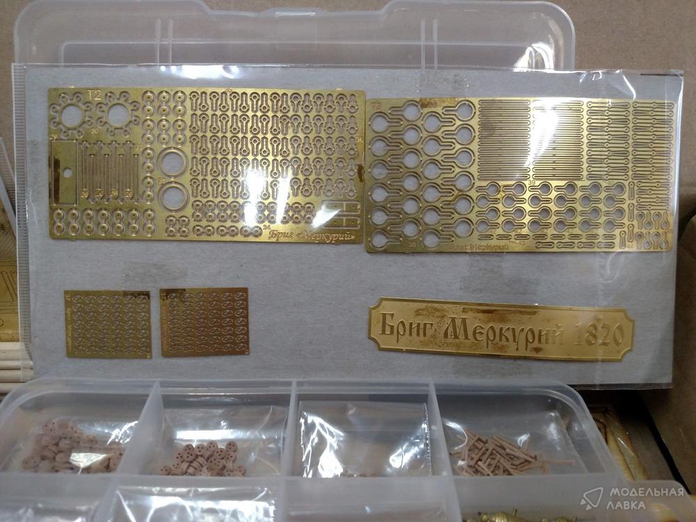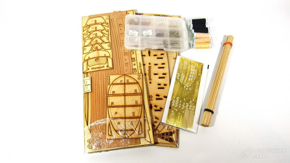 Сборная деревянная модель брига "Меркурий". Масштаб 1:72. В набор входят заготовки деталей выпиленные лазером из фанеры, шпона, досок ценных пород деревьев, ткань для парусов, нитки, латунное литьё, точёные элементы, цветная фотоинструкция, а также подробная трёхмерная инструкция по проводке такелажа.
