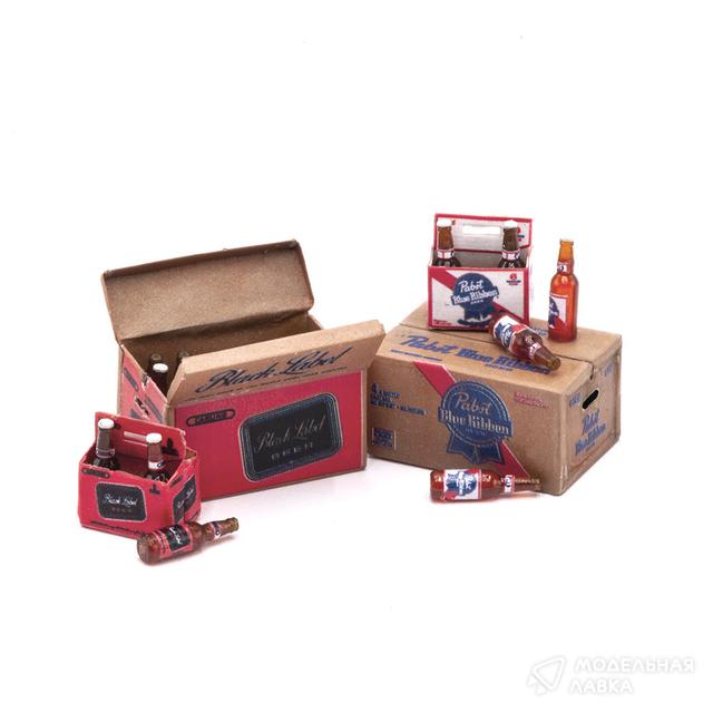 Набор для масштабов 1/24-1/25 для создания коробок с американским бутылочным пивом наиболее распространенных форматов во второй половине ХХ века. Набор позволяет собрать как возвратную картонную коробку на 24 бутылки, так и упаковки-сиксы на 6 бутылок пива. Декаль содержит маркировки на коробки и этикетки двух из четырех основных поставлявшихся в армию США и наиболее распространенных на территории северной америки марок пива: американское Pabst Blue Ribbon и канадское Black Label