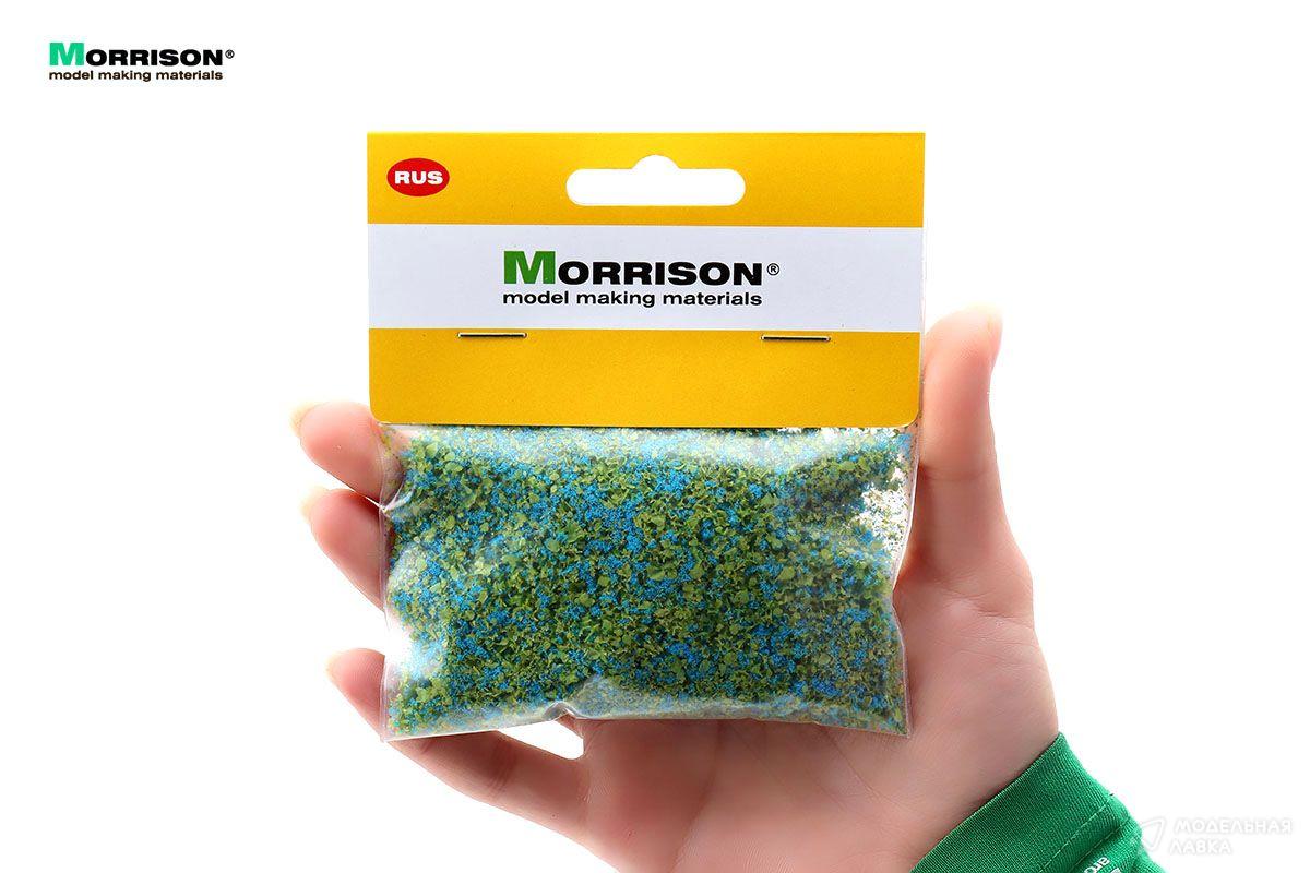 Цветочная присыпка зелёного цвета с синими вкраплениями для создания реалистичного цветочного покрова на макетах и диорамах.
