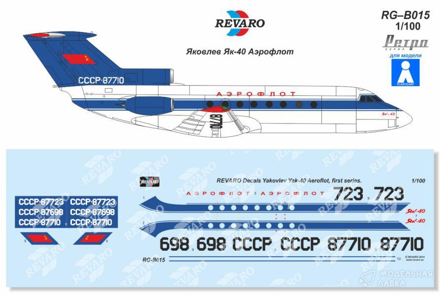 Декаль на Як-40 первой серии с ранней окраской (синий киль). Позднее экземпляры с такой окраской перекрашивались в вариант с полосатым килем. Даны варианты СССР–87698, –87710, –87723. Элементы на киле даны на листке с белой подложкой.