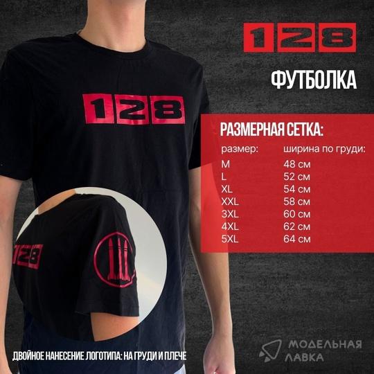 Фирменная футболка "128" - в чёрном цвете, 100 % хлопок, двойное нанесение логотипа краской на груди плече. Деликатная стирка. Футболка (размер - ширина по груди) - 4XL - 62 см.