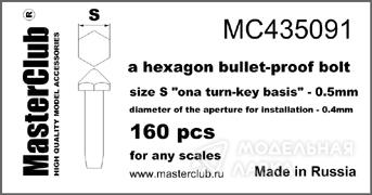 Головка болта пулестойкого шестигранная. Размер S под ключ 0,5 мм. Диаметр отверстия под установку 0,5 мм. Количество в комплекте не менее 180.