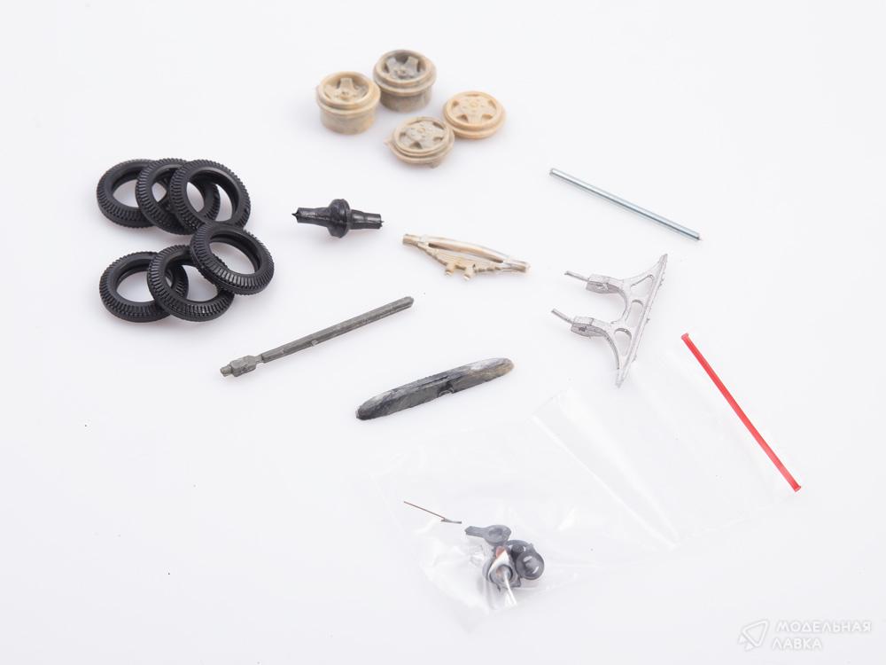 Комплектация: Корпус - 1 Шасси -1 Салон - 1 Бампер передний (пайка+белый металл) - 1 Диски колес -4 Резина - 6 Карданный вал - 1 Рессора передняя - 1 Приборная панель - 1 Задний мост - 1 Фары-стекло - 2 Ободки фар - 2 Корпуса фар - 2 Габаритные подфарники - 3 Руль - 1 Дворники (пайка) - 1 Оси - 2