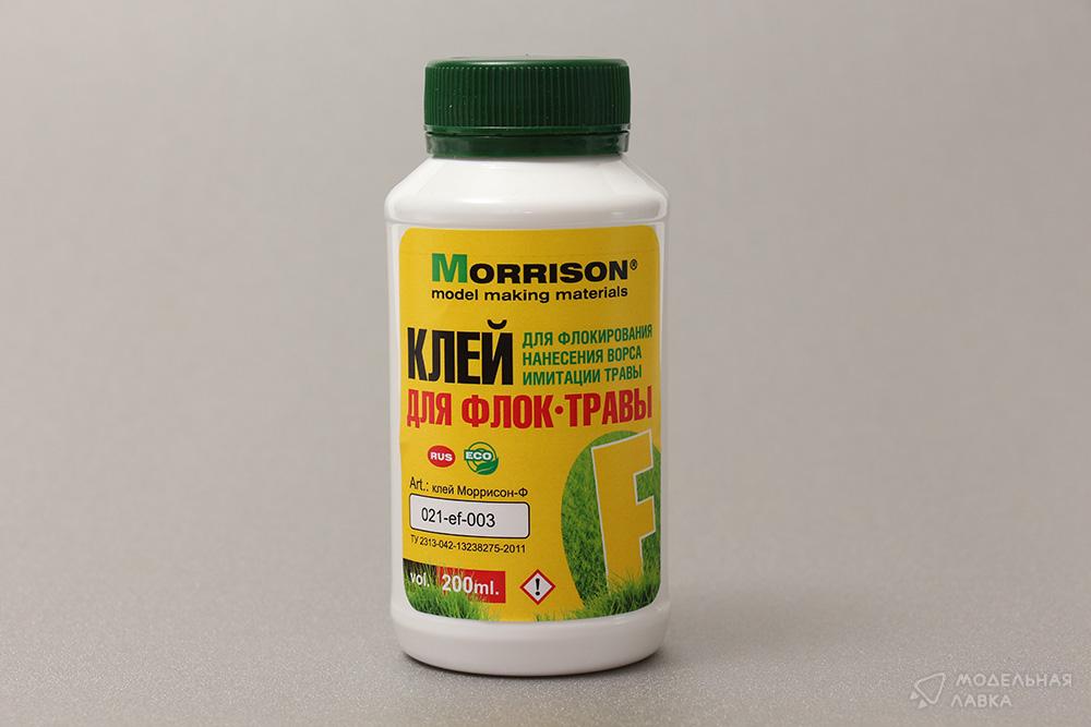 - Клей для флока Morrison при необходимости легко колеруется акриловыми красками (например в цвет земли или в цвет зелени) или может наноситься на уже окрашенную поверхность (так как после высыхания имеет прозрачно-матовую структуру). Благодаря этому приему создается эффектное реалистичное покрытие необлагороженного земного покрова при прореженном нанесении травы для макета.