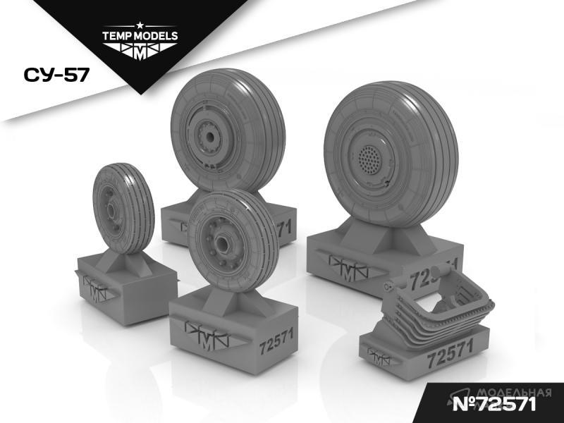 Колеса шасси Су-57 - в наборе даются два передних и два тормозных колеса. Имитирована нагрузка,  детализирован протектор и технические надписи, даны элементы тормозной системы. В наборе также дается брызговик передней стойки верной формы, минимальная толщина элемента которого составляет 0,15 мм.