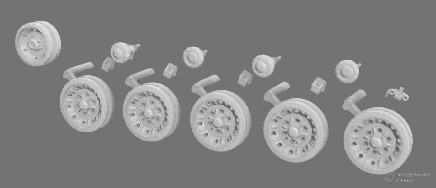 Колёса К-70 c просадкой на цельных дисках (поздние) для модели фирмы "Звезда", арт. 3707 (двумя деталями, диск отдельно)