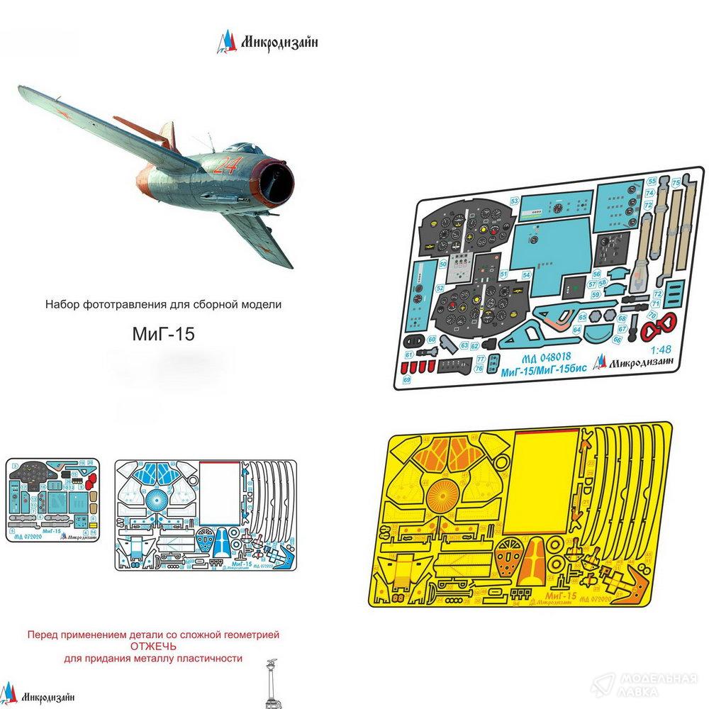 Набор фототравления на миГ-15/МиГ-15бис от Bronco. Масштаб 1:48. Материал: латунь 0,15 мм. Набор комплектуется 2 пластинами фототравления (в том числе одной цветной пластиной приборной доски, ремней) и полноцветной инструкцией. Количество уникальных деталей 75. Уровень сложности: средний.