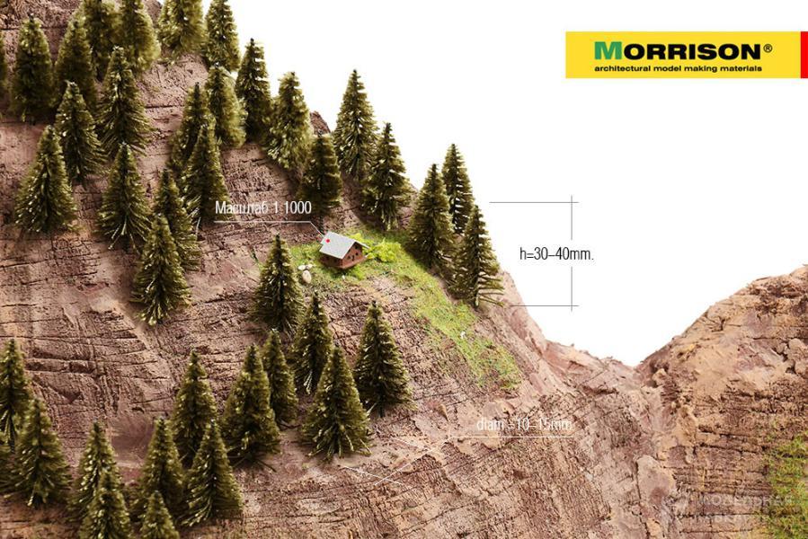 2. На макетах в масштабе 1:300 -1:500 - "миниатюрные ёлочки" имитируют взрослые деревья хвойных пород (ель, лиственица, пихта, кедр и пр.)