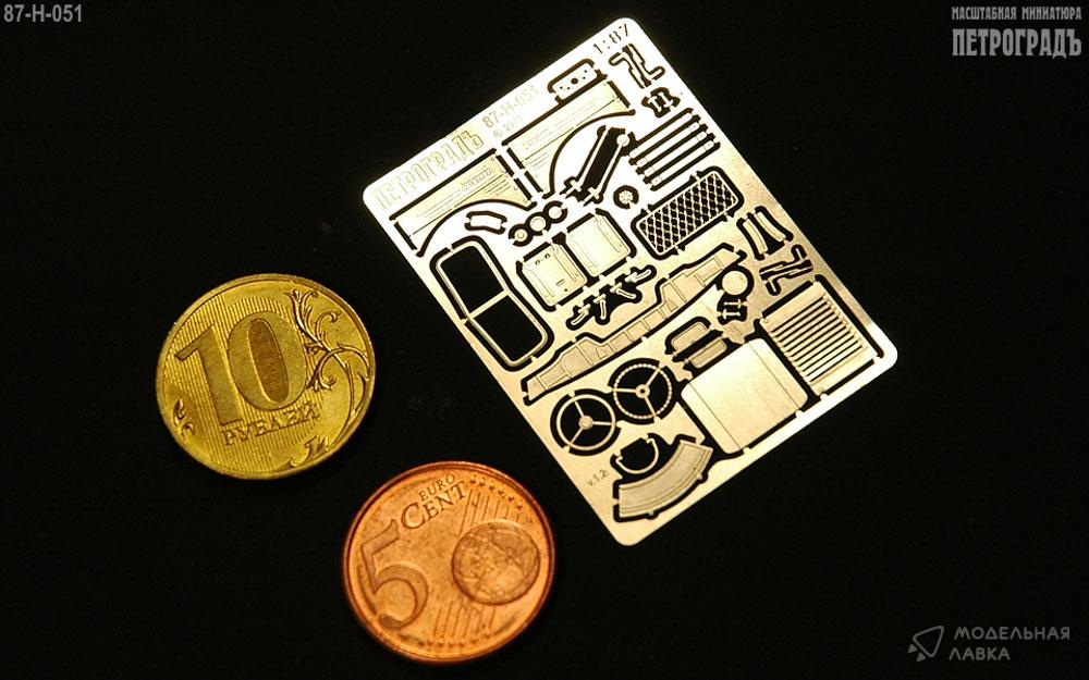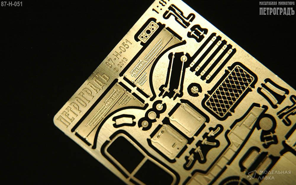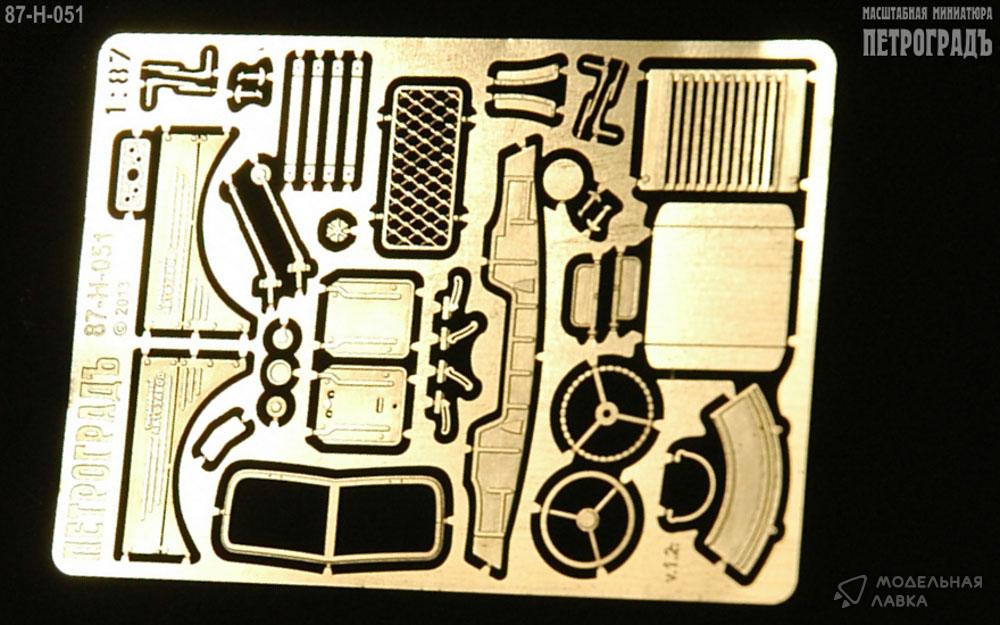 1:87 набор для Горький-51/63 в составе: боковины капота Горький и ЗиМ, бампер после 1957, 1 рамка лобового стекла, 1 сетка на заднее окно кабины, пара брызговиков (после 1957) с откосами, 2 пары стеклоочистителей ("дворников"), 2 пары запоров капота, 2 пары кронштейнов подёма ветрового стекла, 1 горловина бензобака, 1 лючок воздухозаборника, пара солнцезащитных козырьков, 2 боковых зеркала, 1 пара накладок на крылья Горький-63, 1 сквозная радиаторная решётка, 1 приборная панель, 1 рулевое колесо, 1 ведро; альпак 0.1 мм