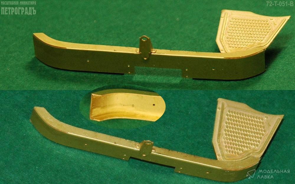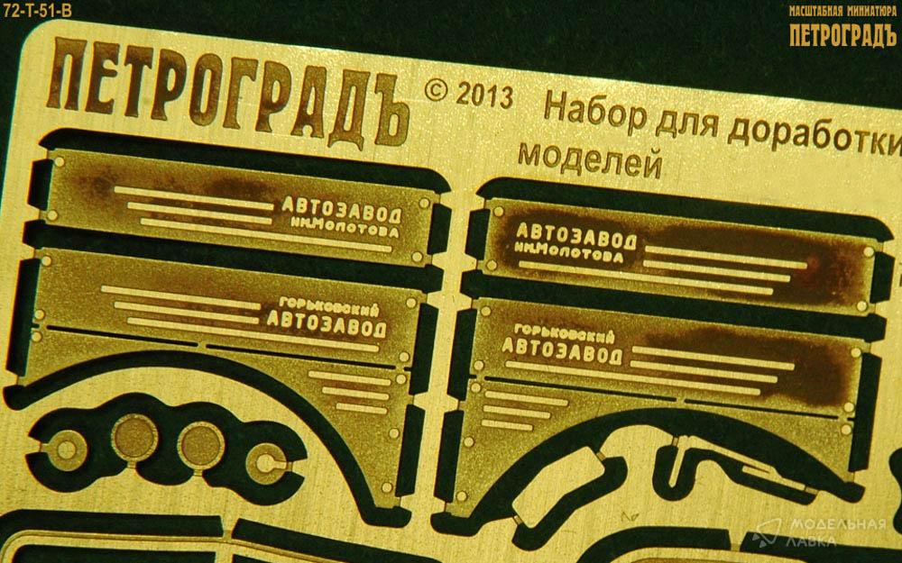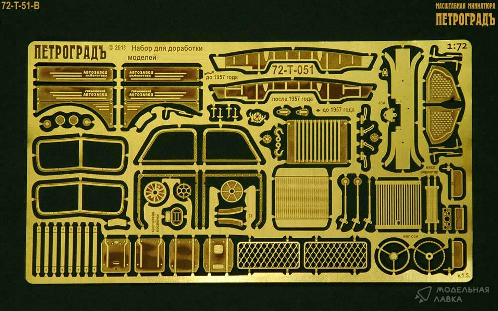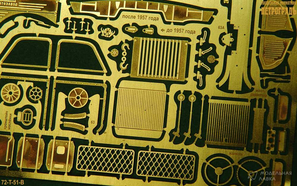 1:72 набор для Горький-51/63 в составе: боковины капота Горький и ЗиМ, бамперы до 1957 и после 1957, бампер Горький-63 с накладками, боковины барабана лебёдки и крюк, 2 рамки лобового стекла, 2 сетки на заднее окно кабины, брызговики до 1957 и после 1957 с откосами, 2 пары стеклоочистителей ("дворников"), 2 пары запоров капота, рамки боковых окон и накладки на двери с заклёпками для кабин до 1957 года, 2 пары кронштейнов подёма ветрового стекла, 3 горловины бензобака, 2 лючка воздухозаборника, 3 боковых зеркала, 1 кронштейн маслёнки, 1 пара накладок на крылья Горький-63, 1 сквозная радиаторная решётка, жалюзи радиатора, имитация масляного радиатора, накладки приборной панели и ящика, солнцезатиные козырьки; латунь 0.1 мм.