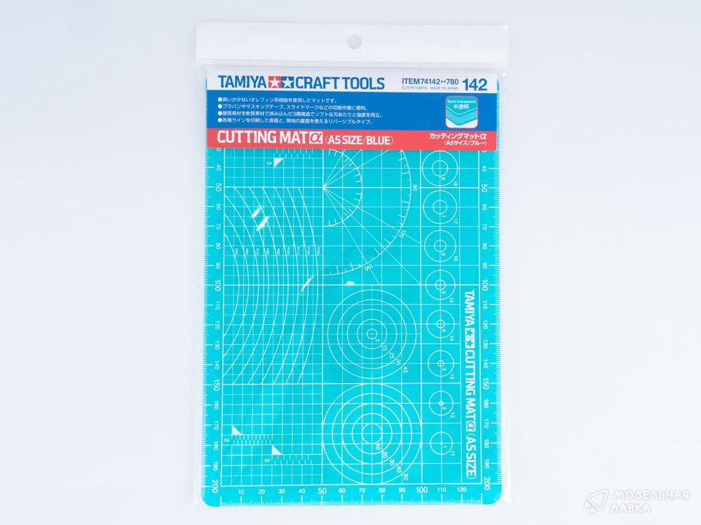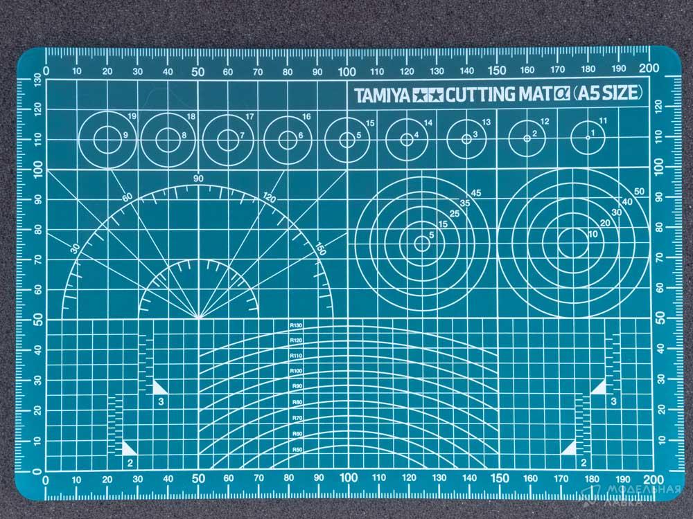 Гибкий коврик для резки и разметки 74142 Tamiya. На коврике не остается порезов после отделения деталей ножом или скрайбером (самозатягивающийся эффект) и не тупятся лезвия. Для отрезания деталей можно использовать две стороны коврика. Для удобства в работе, с одной стороны на коврик нанесены разметки в виде различных графических линий (круги, прямые, квадраты, радиусы, линейки и тд.)