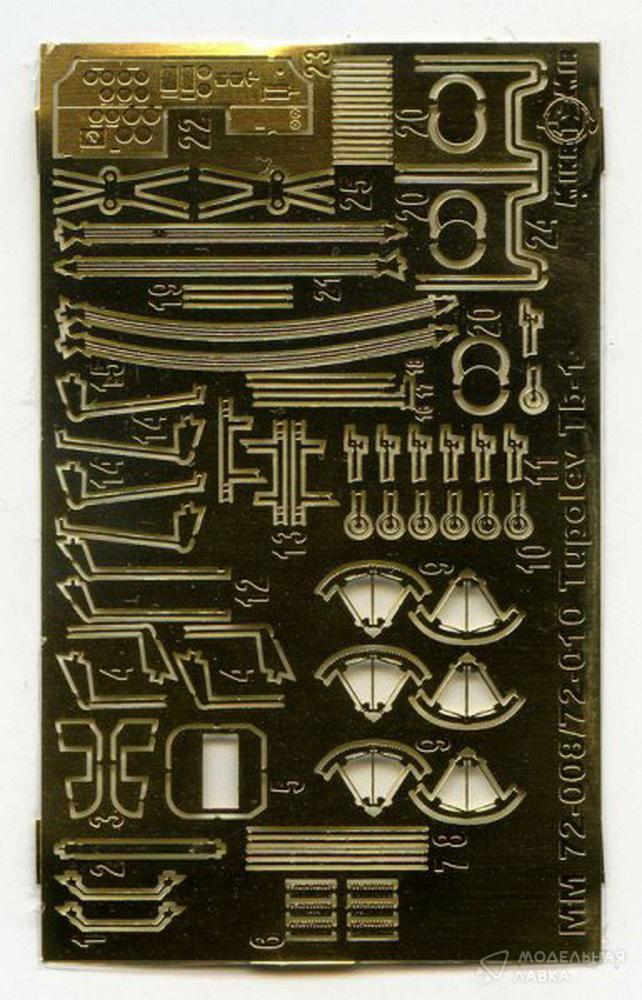 Модель Самолёт Tupolev TB-1P (MTB-1)? в масштабе 1/72 от фирмы "МикроМир" состоит из: набора литников для сборки модели, остекления, декали, фототравления, инструкции.