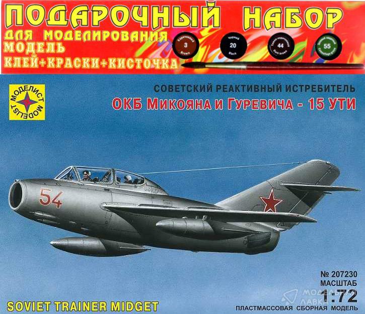 Сборная модель советский реактивный истребитель ОКБ Микояна и Гуревича - 15 УТИ с клеем, кисточкой и красками.