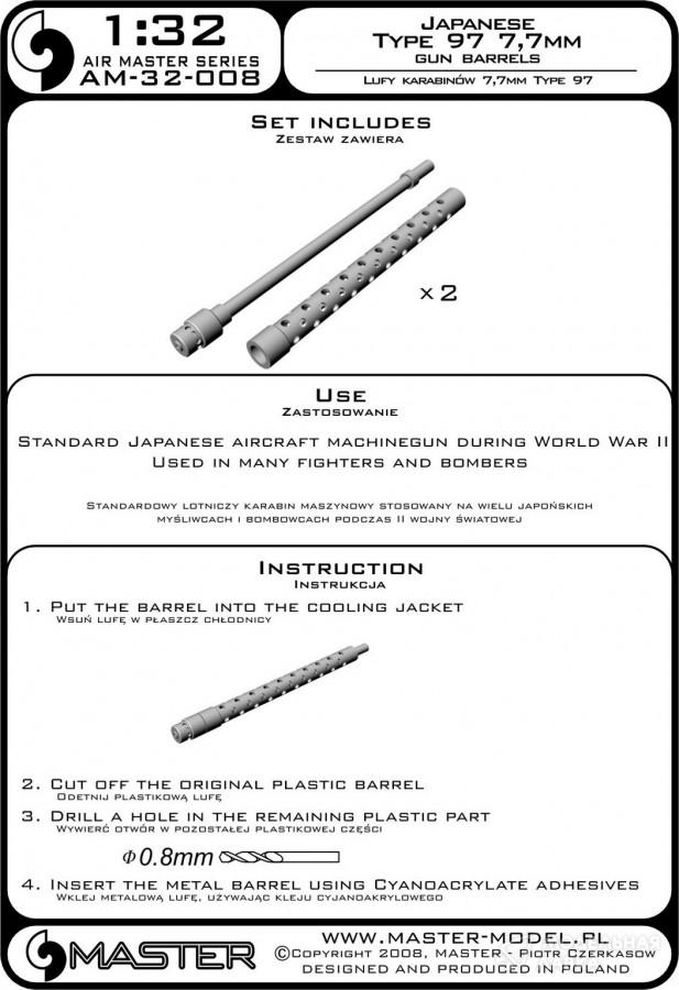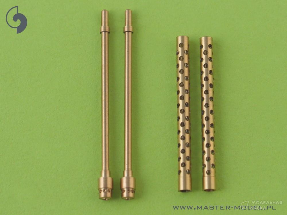 Используется на многих истребителях и бомбардировщиках. В комплект входят два точеных латунных ствола с просверленным кожухом охлаждения. Его очень просто использовать в Вашей модели, что делает ее предельно реалистичной. Просто отрежьте оригинальный пластиковый ствол, просверлите отверстие в оставшихся пластиковых деталях и вставьте металлический ствол, используя цианоакрилатный клей.