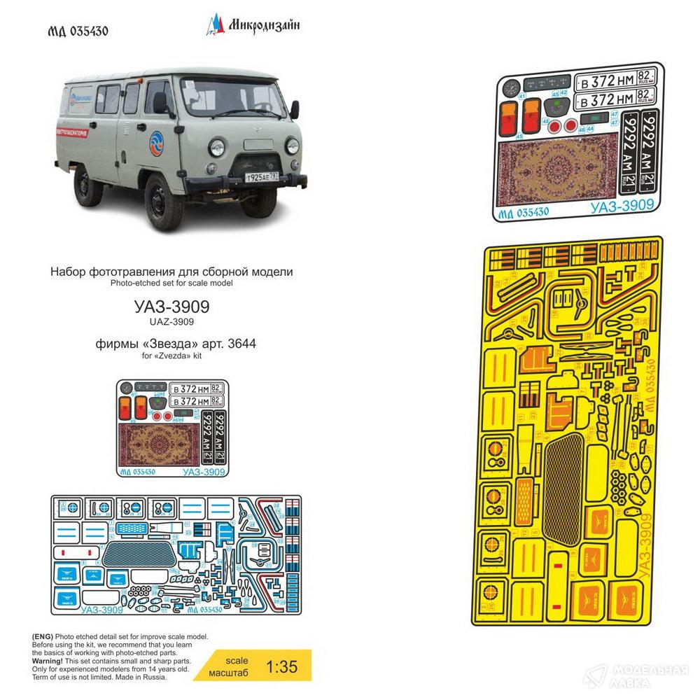 Набор фототравления на УАЗ-3909 от Звезды. Масштаб 1:35. Материал: латунь 0,17 мм. Набор комплектуется двумя платами фототравления (в том числе цветными приборными досками) и цветной инструкцией. Количество уникальных деталей: 48 шт. Уровень сложности - средний.
