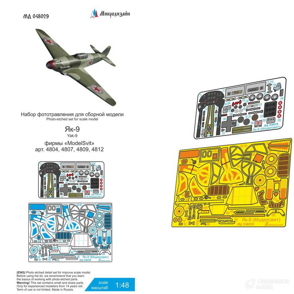 Набор фототравления на Як-9 от Моделсвит. Масштаб 1:48, Материал: латунь 0,15 мм. Набор комплектуется 2 пластинами фототравления (в том числе одной цветной пластиной приборной доски, ремней) и полноцветной инструкцией. Количество уникальных деталей 97. Уровень сложности: средний.